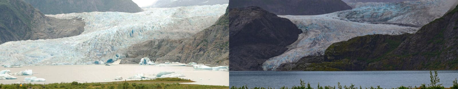 Mendenhall Glacier in Juneau. Over the last 20 years, the glacier ice attached to bedrock has receded at about 56 feet per year, while ice on the lake itself has receded at approximately 148 feet per year. Photo (right) by James W. Thompson.
