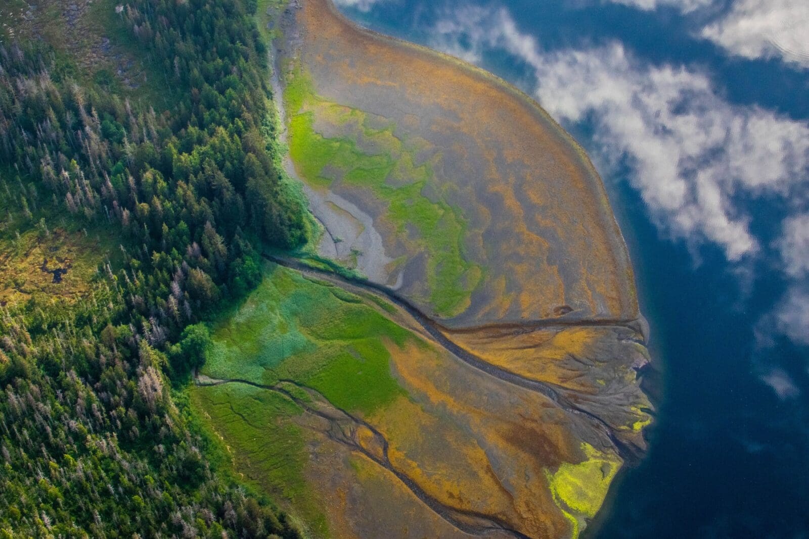 A bird's eye view over an estuary nestled along the coastlines of Southeast Alaska. Photo by Ryan Morse.